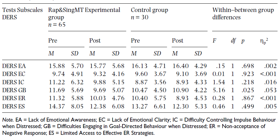 Nella tabella 5 sono stati analizzati anche i dati all’interno di ciascun gruppo separatamente. I risultati dei punteggi dei problemi valutati (SDQ T, SDQ P, SDQ K, DERS) sono stati sommati in un punteggio totale del “problema”. All’interno dei soggetti del gruppo Rap&SingMT, un t -test a campioni appaiati ha mostrato che i punteggi del problema sono diminuiti significativamente dal pre-trattamento ( M = 95,99, SD = 38,04) al post-trattamento ( M = 86,14, SD = 30,63, t (64 ) = 3,14, p <.004). All’interno dei soggetti del gruppo di controllo il calo dei punteggi dal pre-trattamento ( M = 90,83, SD = 26,02) al post-trattamento ( M = 88,33, SD= 25,24) non era significativo, t (29) = .77, p < .45.