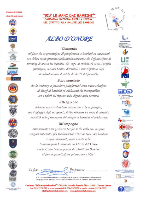 Uno dei religiosi più noti e amati d’Italia, fondatore della Comunità EXODUS, un uomo che ha fatto dell’aiuto e dell’ascolto una ragione di vita, ha approvato e sottoscritto il nostro messaggio contro gli abusi in tema di ipermedicalizzazione dei bambini, facendosene con entusiasmo Testimonial